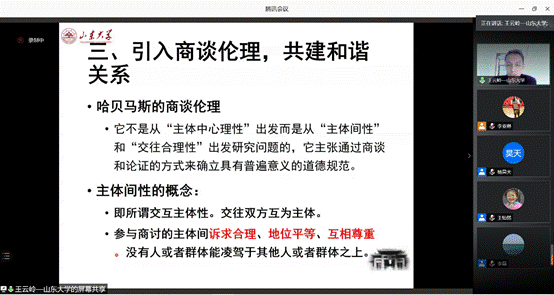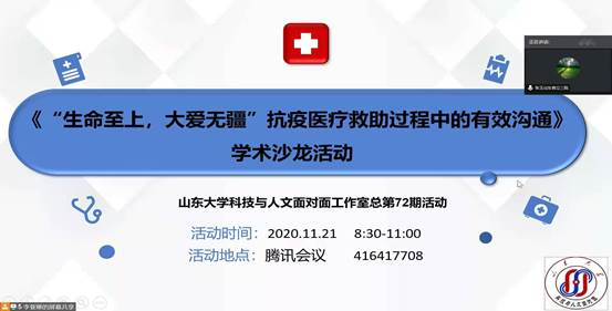 11月21日上午,山东大学科技与人文面对面工作室总第72期“生命至上,大爱无疆”抗疫医疗救助过程中的有效沟通青年学者学术沙龙活动顺利举办。本次活动荣幸邀请到山东大学齐鲁医院郭海鹏老师、山东省立第三医院医务社工张玉老师、山东大学心理咨询室李晓含老师、山东大学法学院丁杰老师、山东大学齐鲁医学院吴金香老师、山东大学基础医学院王云岭老师、山东大学政治学与公共管理学院韩自强老师担任主讲人。本次沙龙由科技与人文面对面工作室主办,山东大学团委副书记(兼)、马克思主义学院教师李磊主持,来自全校不同学院和年级的百余名学生参与。