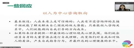 李晓含以“人为本,心为桥”为主题,与同学们交流她在心理咨询中的沟通经历,并回应了同学们的一些问题、好奇。李晓含强调了心理咨询中“共情”这一重要概念,并指出倾听的重要性。疫情期间,心理咨询中心以文字、电话、视频等方式,解决学生、家长、教师等不同对象等心理问题。通过李晓含的讲解,同学们对心理中心有了更深入的了解,相信日后遇到问题时也会更加放心地寻求心理咨询中心的帮助。