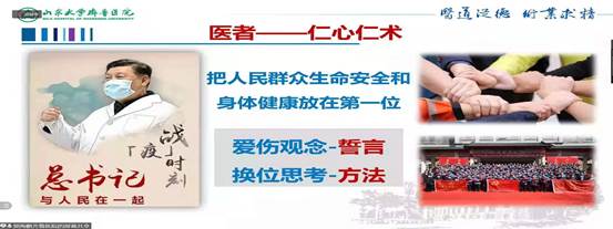 郭海鹏的主讲题目为“医疗救助中的换位思考与爱伤观念”。郭海鹏从医学模式的发展切入,表示在生物-心理-社会现代医学模式背景下,广大医务工作者应注重关心病人、关注社会、注重技术与服务的共同提高。好医生的标准应为德才兼备、医道从德,术业求精、严博并举。郭海鹏表示,齐鲁医院在抗击疫情过程中借助武汉方言手册、爱心图书、膳食护理等措施,加强爱伤观念,全方位为患者服务。