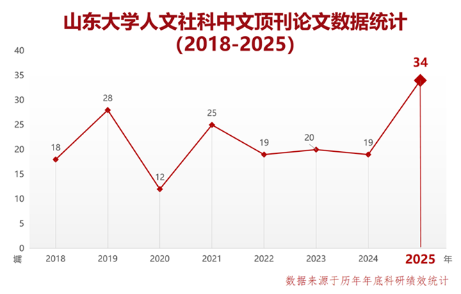 2025年度,山东大学作为第一机构在《中国社会科学》《历史研究》《哲学研究》等人文社科中文顶级学术期刊上发表论文34篇,发表数量创历年新高,标志着学校在人文社科领域的基础研究能力与学术影响力迈上新台阶。